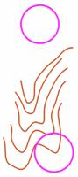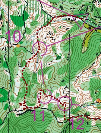10番をパンチ後、地図を見て浮かんだ11番へのルートのイメージは「大きな沢の左側を登った所」。おおむね右図のようなイメージだったと思う。コントロール周りの細かい沢の流れは全く読まずに、先の「大きな沢」のみを見ていた。また、地図上の「大きな沢」ばかりに目が行っており、その西側にも沢があることも読んでいなかった。顔を上げて正面に見えた大きな沢を目指して斜めに登っていく。実際に正面に見えた沢は登るべき沢の西側の沢なのだが、「登り」に集中するために地図を見る頻度を落としていたため、ミスをしていることに気付かなかった。沢が登りにくいために左手(東側)の尾根に乗り換えてどんどん登り、登りきる直前あたりで若干イメージに合わないと感じるもそのまま登ると、尾根の頂上付近でコントロール(52番)を発見する。現在地が分からなくなり、左右の沢を覗き込み立ち止まって考える。幸い、52番コントロールが岩のコントロールであることに気付き、周辺の地形と岩から現在地を確認。その後のリロケートでも不安と焦りから無駄な動きが多く、最終的には約4分のミスとなってしまった。